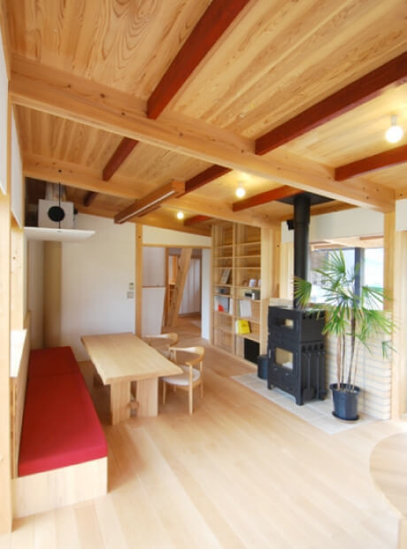 室内は床をブナフローリング、天井を県産の遠山杉、壁を漆喰塗りで仕上げた。