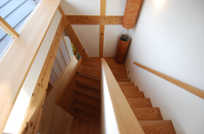 県産材率96%で、太陽光発電と発電時の廃熱とともに太陽の熱を暖房や給湯に利用するOMソーラーを導入し、「CASBEE」(建築物総合環境性能評価システム)の戸建て住宅で最高ランクのS評価をいただいた建物です。連続する大窓に外の緑が映えるLDKは、窓枠を見せないことで、より視覚的な広がりが感じられます。杉板の外壁、ブナのフローリング、遠山杉の天井、漆喰の壁など、自然素材の心地良さも体験してください。