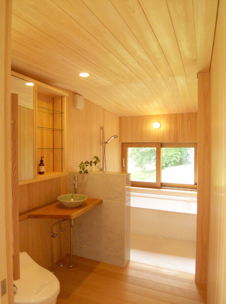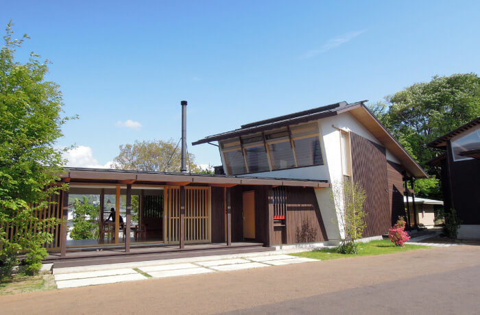県産材率96%で、太陽光発電と発電時の廃熱とともに太陽の熱を暖房や給湯に利用するOMソーラーを導入し、「CASBEE」(建築物総合環境性能評価システム)の戸建て住宅で最高ランクのS評価をいただいた建物です。連続する大窓に外の緑が映えるLDKは、窓枠を見せないことで、より視覚的な広がりが感じられます。杉板の外壁、ブナのフローリング、遠山杉の天井、漆喰の壁など、自然素材の心地良さも体験してください。