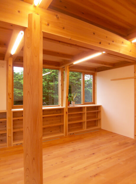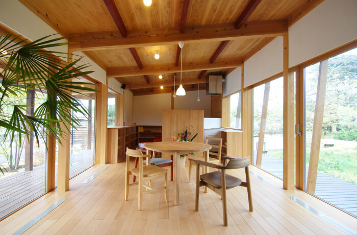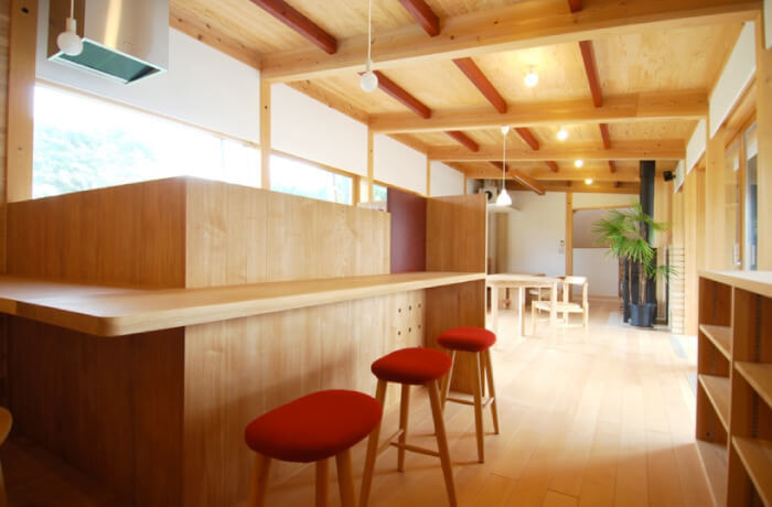 室内は床をブナフローリング、天井を県産の遠山杉、壁を漆喰塗りで仕上げた。