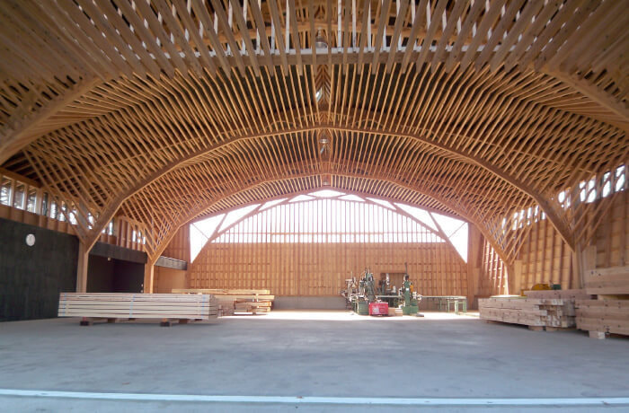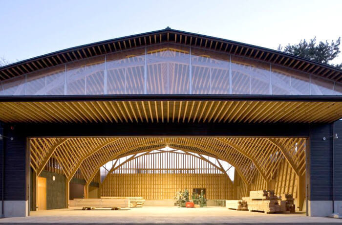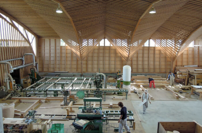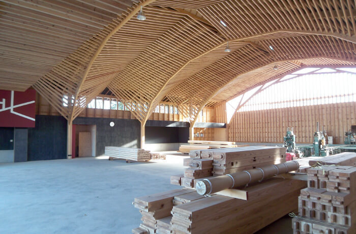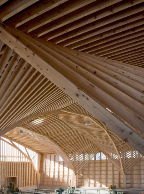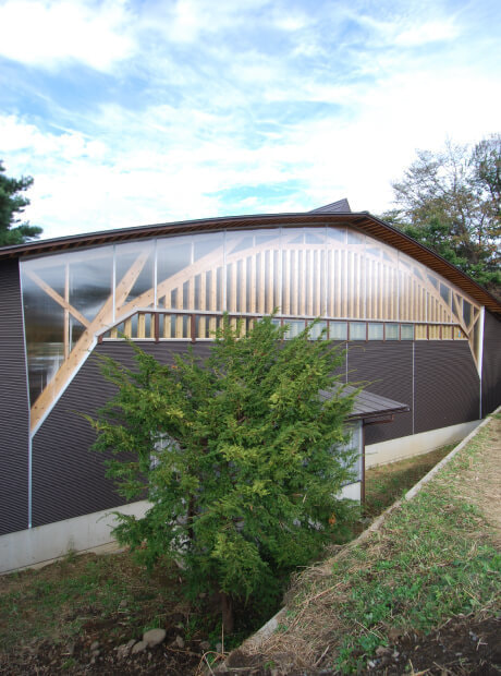 北沢建築には、若手からベテランまで社員大工が多く在籍しており、「墨付け」「手刻み」をおこない、大工自らの手で組み立て上棟を迎えます。そして、こうした大工の仕事場である加工場そのものが、大工による木の家づくりに取り組む北沢建築のシンボルともいうべき建物になっています。「在来工法」を応用し、住宅と同じ断面材料で構造計算された木組みは、「シンプルで美しい」という私たちの家づくりを象徴しています。