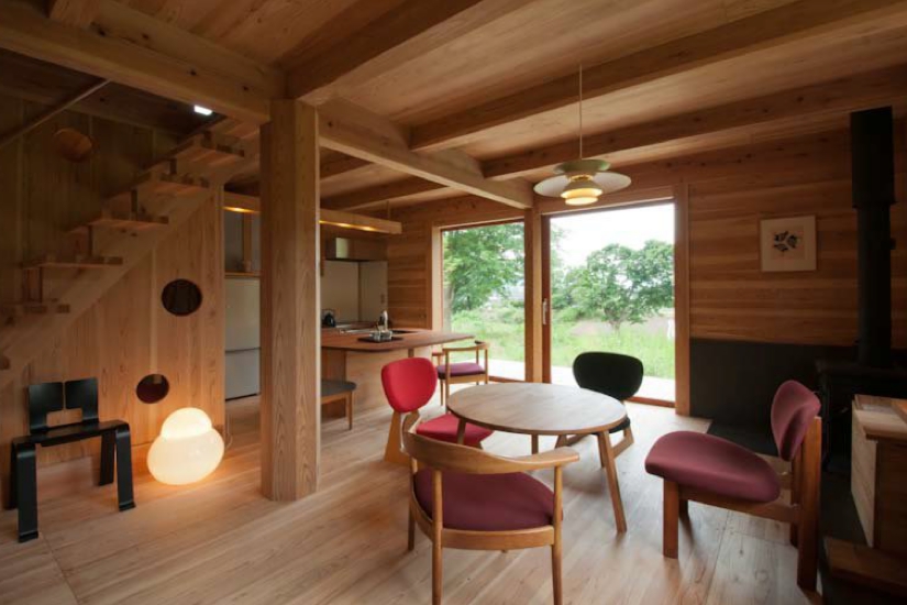 Ms建築設計建築設計事務所の三澤さん設計による、宿泊体験できるモデルハウス。 外壁は杉板張り。27坪のコンパクトでシンプルなスタイル。 リビング。シンク周りには水に強いチークを使用。キッチンの足元は15センチ下げられており、椅子に座る家族と目の高さが同じになるよう計算されている 杉の三層パネル「Jパネル」の様々な使い方が提案されている。現代の暮らしに必要な耐震、断熱などの性能制も十分に備わっており快適な空間だ 2階へと続く階段。 2階は屋根の形がそのまま現れる「小屋組み」に。広い空間でこそ映える、マレンコのソファーがその魅力を発揮している 浴室の壁や天井は水に強い漆塗で高級感をプラス。ヒノキづくりの丸い浴槽も趣き深い。 命名元となった胡桃の木が大きく枝を広げる。