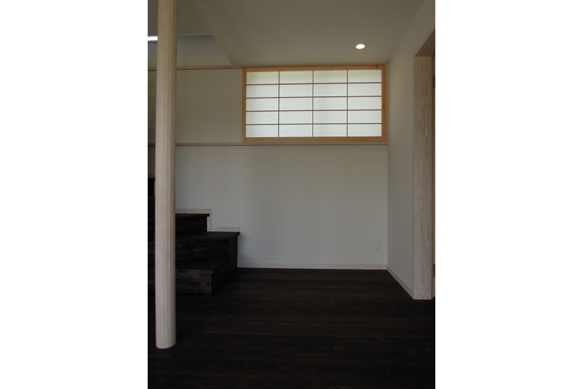 宮田村新田 ki-bako カーテンではなく、障子。 リビング階段には窓を設け、明るさを確保。 シンプルな形のki-bako。 浴室はハーフユニットバス。壁には無垢板を貼っています。 キッチンの収納は大工の手造り。