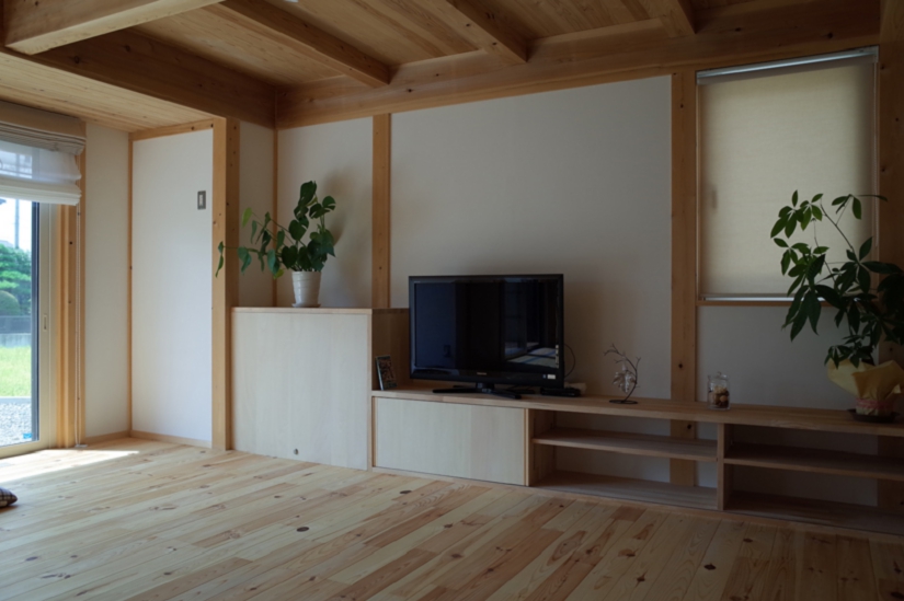 辰野町宮木の家 ロフトへ上がる固定式のハシゴ階段。 外観はガルバリウム鋼板と塗り壁。玄関とバルコニーの木がアクセント。 大工が造ったTV台。家具に統一感が出ます。 リビングと繋がる箱階段。 トイレにはたっぷり収納棚を設けました。