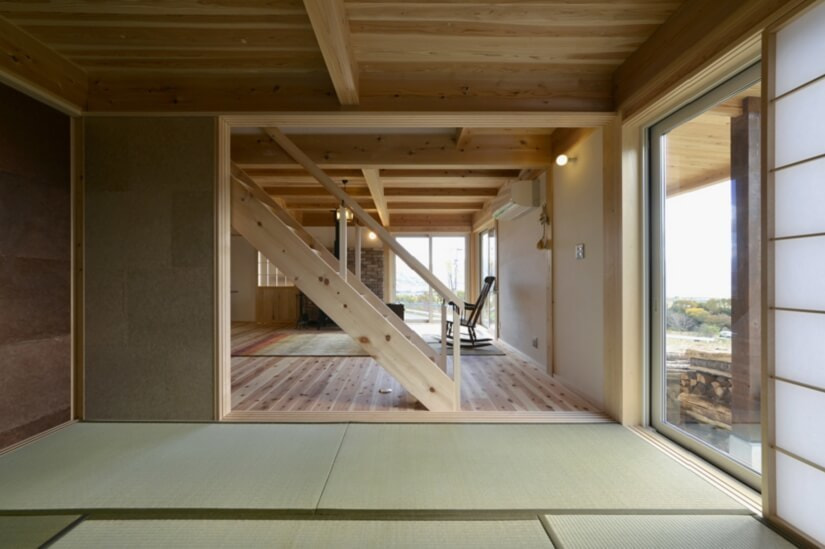 リビングと一体的に使える和室。階段手摺は存在感を無くしたデザイン。