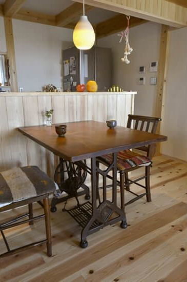 古いミシンをテーブルにリノベーション。照明器具も温かみがあります。